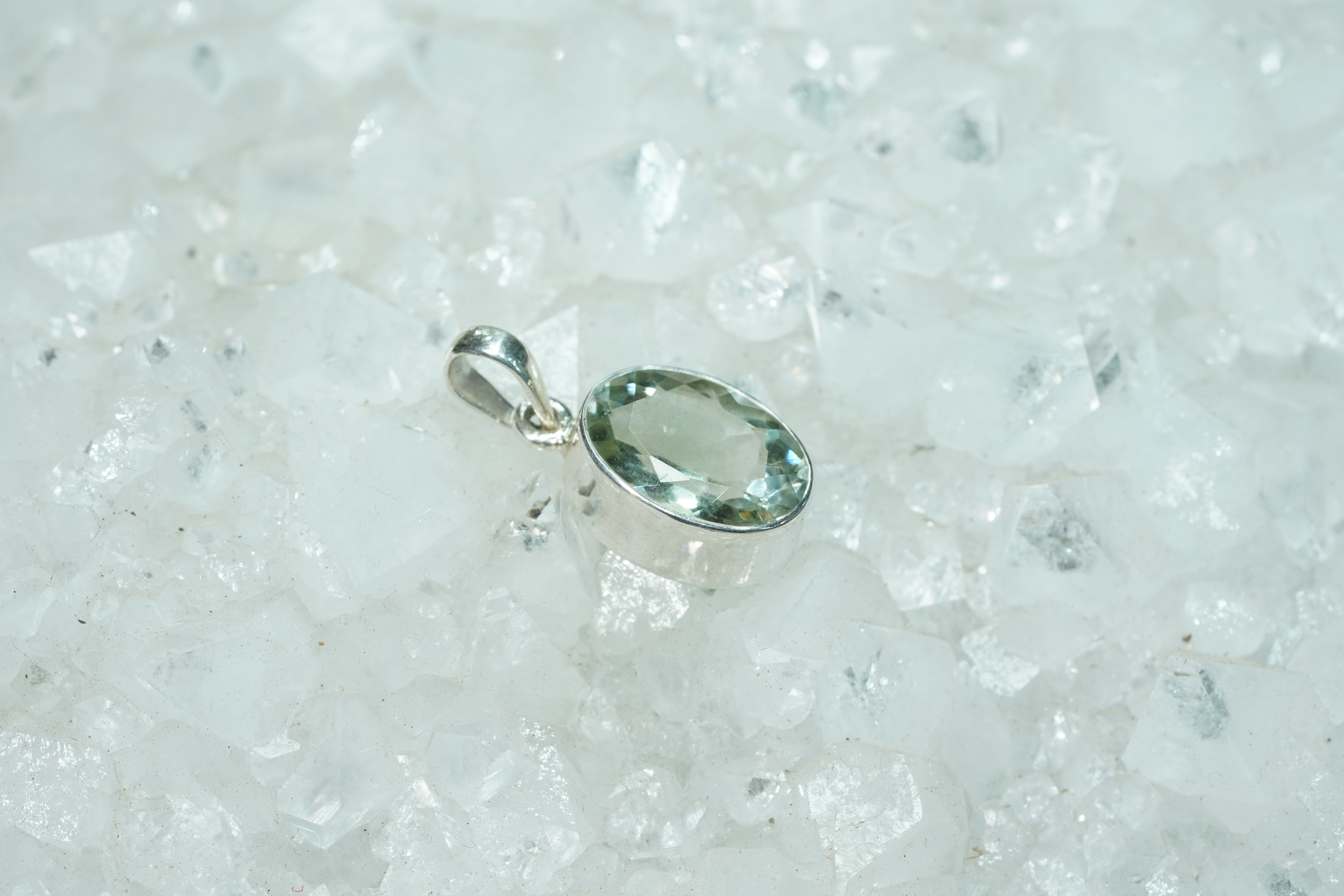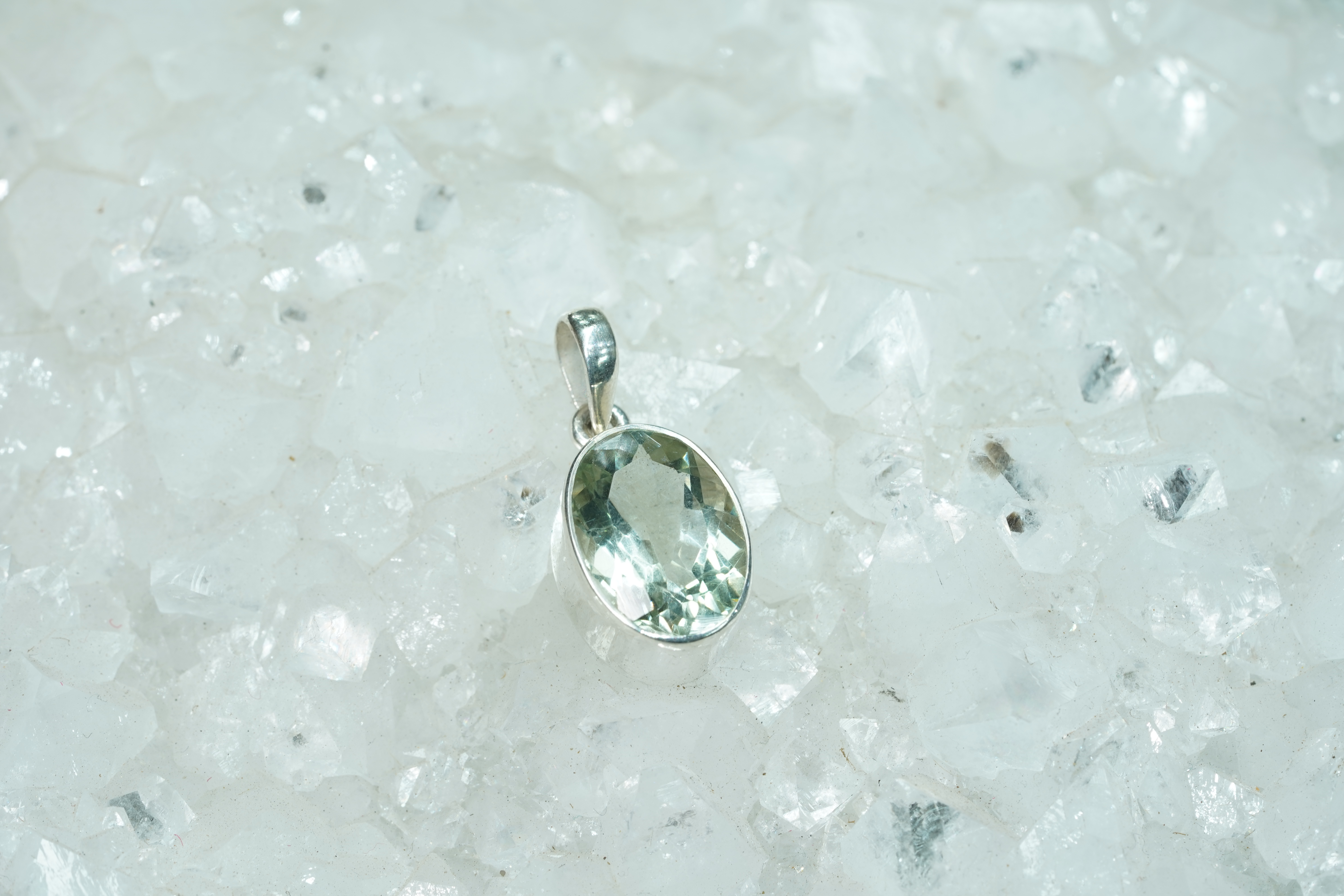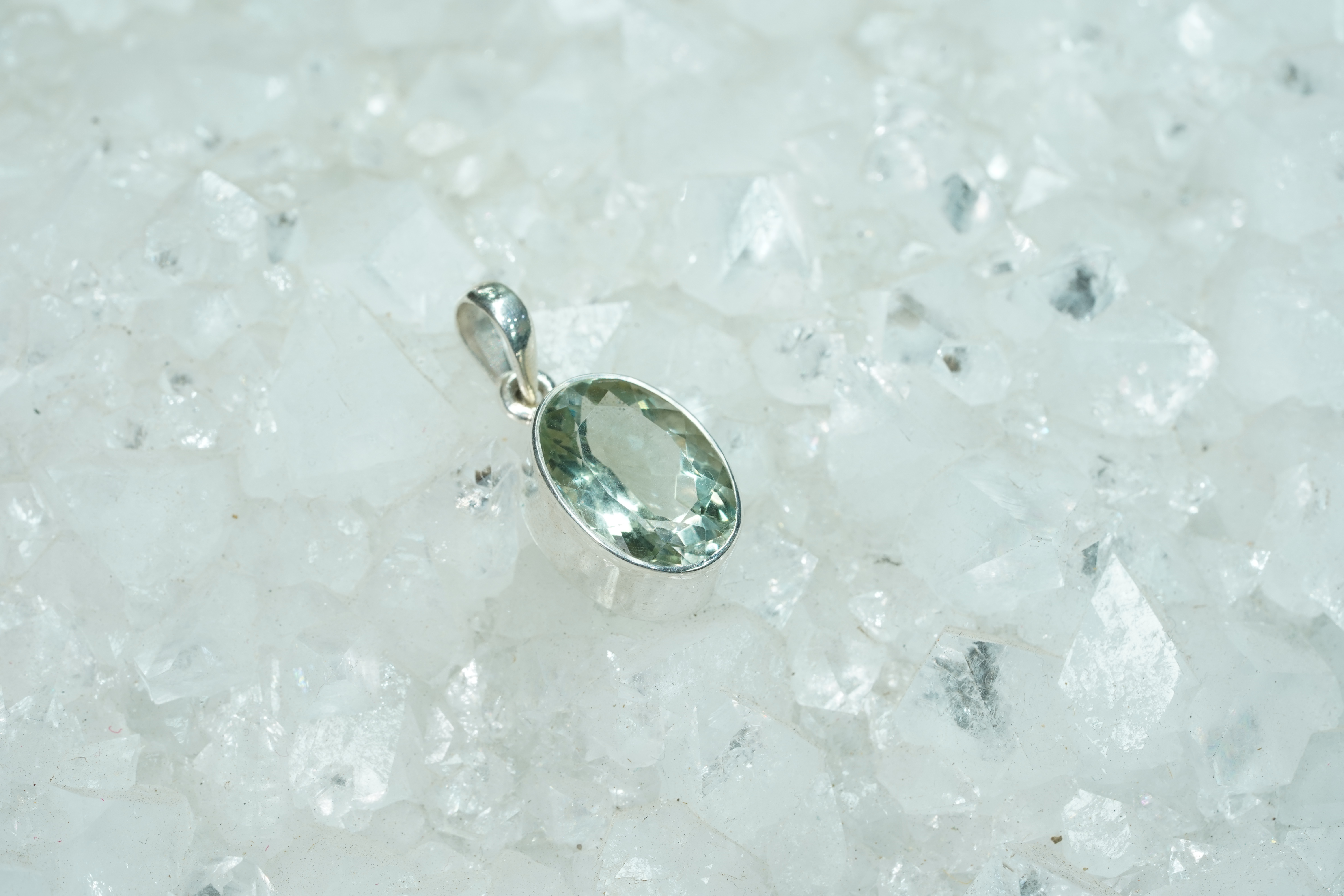 Prasiolith ist ein grüner Stein aus der Gruppe der Quarze:Der Stein in diesem Anhänger stammt aus Brasilen und ist lupenrein.